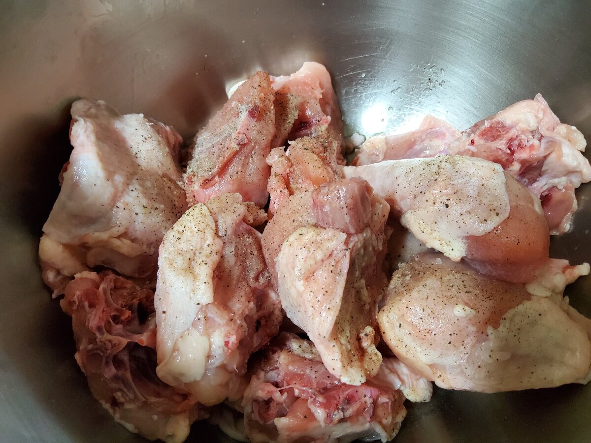 1. Курицу нарезать на порционные кусочки. Положить в глубокую тарелочку, добавить 2 ст.л водки, несколько щепоток молотого перца и 1/3 ст.л соли, хорошо перемешать. Оставить на 30 минут.