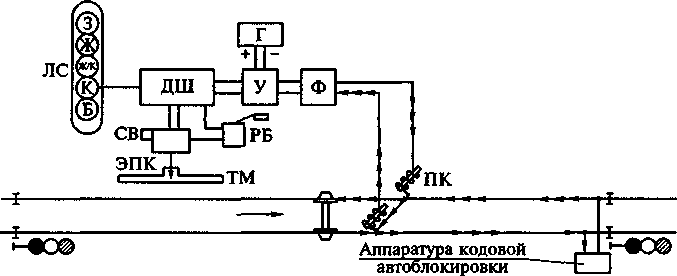 ЛС — локомотивный светофор; ДШ — дешифратор; Г — генератор; У — усилитель; Ф — фильтр; СВ — свисток; РБ — рукоятка бдительности; ЭПК — электро-пневматический клапан; ТМ — тормозная магистраль; ПК — приемные катушки чается соответствующий огонь локомотивного светофора ЛС. Если на путевом светофоре горит зеленый огонь, то в цепи проходят три импульса тока в кодовом цикле и на локомотивном светофоре горит также зеленый огонь. При включенном желтом сигнале проходят два импульса тока в кодовом цикле, и на локомотивном светофоре горит также желтый огонь. От светофора с красным огнем поступает код с одним импульсом тока в цикле, и на светофоре локомотива включается желтый огонь с красным.