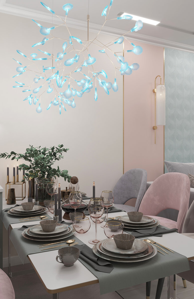 Главное помещение в квартире – кухня-гостиная. Именно здесь будет проходить совместное времяпрепровождение семьи и встреча с гостями. Помещение вытянутое и условно разделено на несколько зон. Кухня – функциональная, оборудована современной техникой и имеет вместительные системы хранения. Столовая зона – уютное место с удобными креслами и украшенная люстрами Agate Feathers (сочетание металла и натурального камня). В гостиной зоне – комфортная мягкая мебель, на стенах сочетаются покраска и акцентные обои, а также декорированы латунными молдингами.