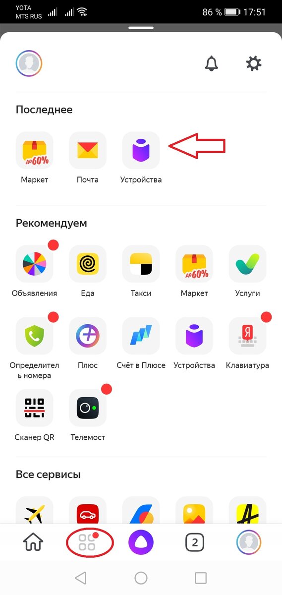 Ну а пока давайте разберемся с тем, с чем есть. Чтобы поменять команду вызова, запустите приложение «Яндекс» на телефоне и войдите в свою учетку. Потом откройте меню и выберите пункт «Устройства».