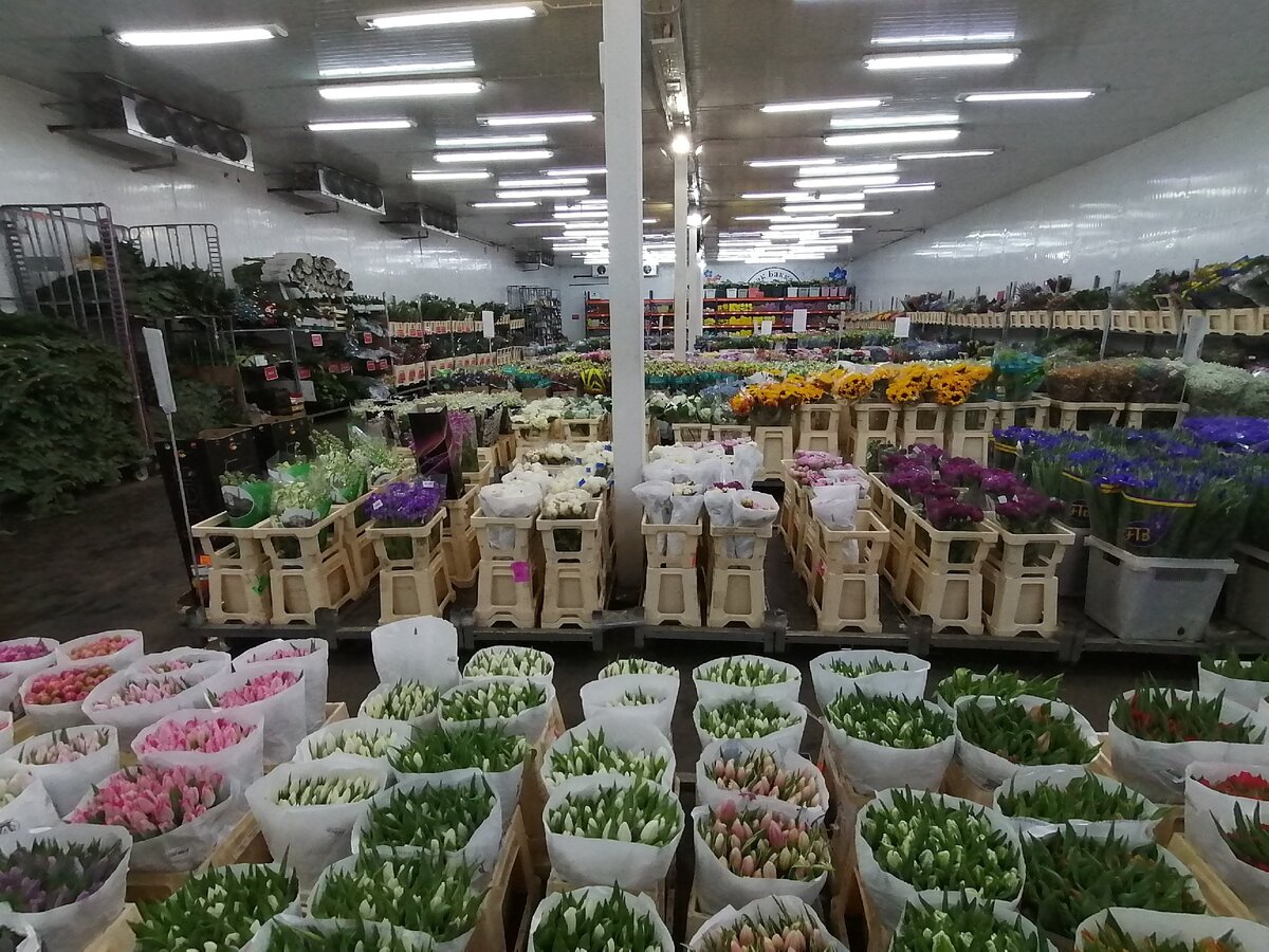 Продажа цветов только оптом. От 1 упаковки. Кол-во штук в упаковке зависит от цветов. Тюльпанов, например, в упаковке 50 штук. Стоимость разная. Зависит от сорта.