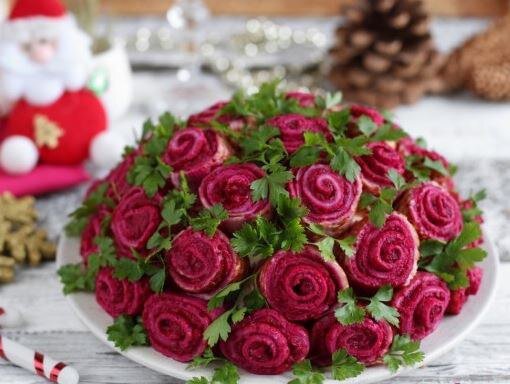 Приступаем к овощам. Если они у вас еще не сварены – отвариваем их как обычно. Морковь, картофель и свекла отварились (желательно взять овощи в равной пропорции), можно измельчать на мелкой терке в разные емкости. К отваренной и натертой свекле добавляем немного майонеза и выдавливаем к ней через пресс одну-две дольки чеснока.4/9