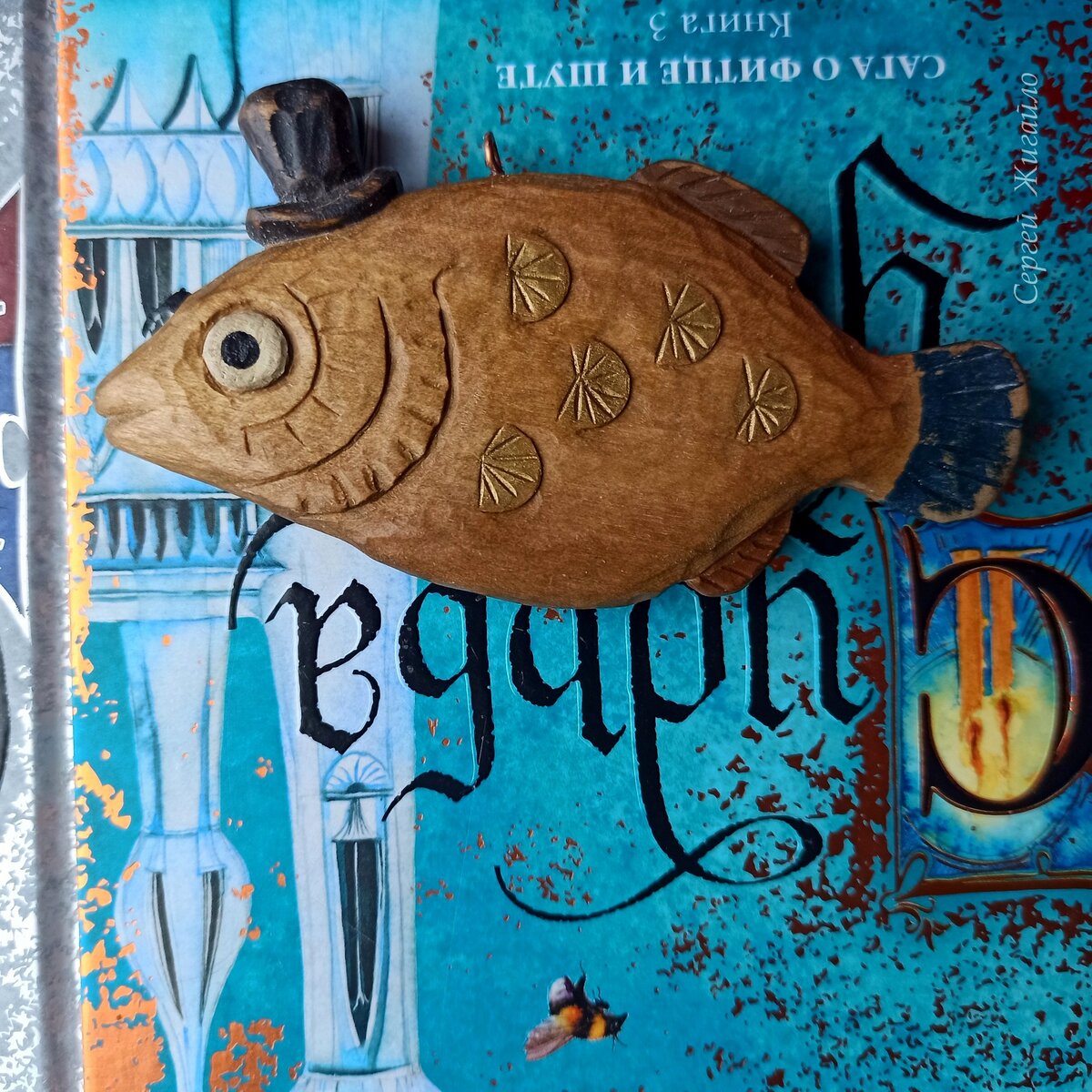 Очень умная рыба, которая носит цилиндр. Мне кажется, что у неё где-то и трость имеется)) Это не первая странная рыба моей работы, вспоминается давняя деревянная брошь под названием "Хитрая рыба, проглотившая грушу")) Обратите внимание на шляпу и плавники - работа потёрта для придания налёта винтажности: