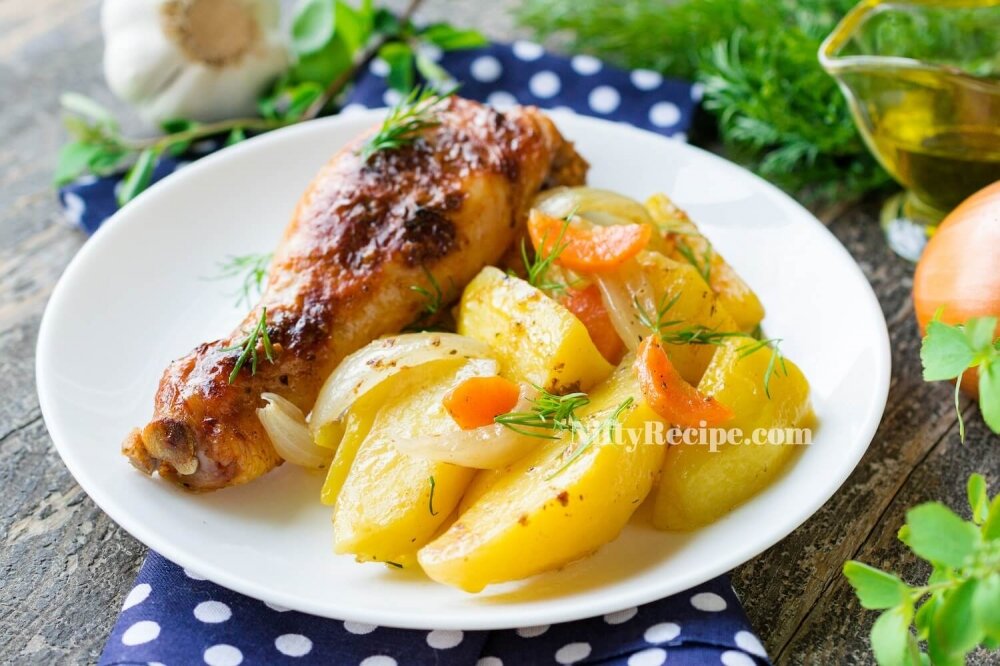 Probably, on the note, each hostess has several recipes for delicious dishes, the preparation of which will not take much time, but at the same time will allow you to beautifully and tastily design the festive table. One of these recipes is roasted chicken and potatoes. The recipe of baked chicken legs is simple and understandable, that’s why it is so popular. Tender and juicy white meat is perfectly combined with fragrant potatoes soaked in chicken juice. Supplement the dish with fresh salad or homemade pickles and you will have a full lunch or dinner ready. For the recipe, you can use any part of the chicken: wings, drumsticks, thighs or whole legs. It is better to leave the chicken breast for other dishes, for example, prepare rolls with hangers and cheese or nuggets in a potato crust.