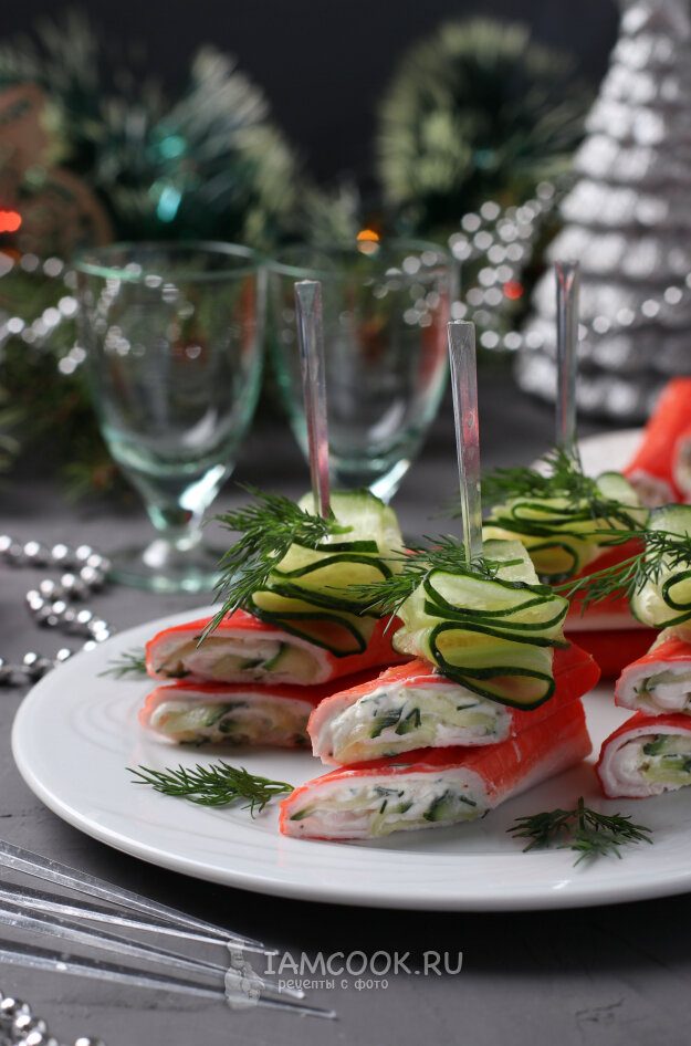 5 МЕСТО: Канапе из фаршированных крабовых палочек огурцом