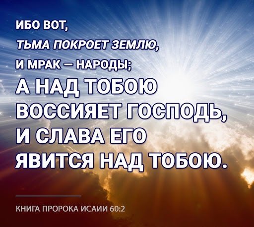 «Восстань, светись, Иерусалим, ибо пришёл свет твой, и слава Господня взошла над тобою. Ибо вот, тьма покроет землю, и мрак — народы; а над тобой воссияет Господь, и слава Его явится над тобой. И придут народы к свету твоему, и цари — к восходящему над тобой сиянию» (60:1-3).