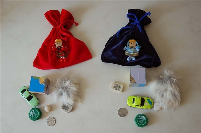 Игра учит различать фактуру и форму предметов. В мешочек, нужно сложить фасолинки, сушеные горошины, пуговицы, бусины разного размера и др. Затем предложить малышу поискать в мешочке что-то интересное, внимательно наблюдая.