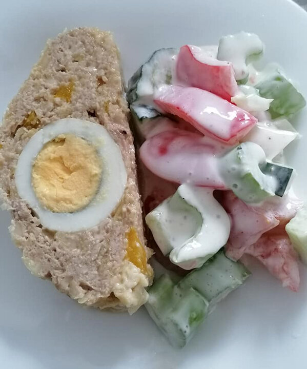 Выложить сверху вторую часть фарша, сформировать рулет, как на второй фотографии. Можно сверху положить масла, можно сметану, можно ничего не делать.