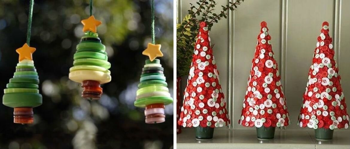 Маленькие пуговичные игрушки можно сделать своими руками за 10 минут. Берем нить, делаем петлю, которая послужит основой, затем нанизываем на нее пуговички по принципу пирамиды. Не забываем про верхушку-звездочку. Закрепляем ее петелькой и готово!