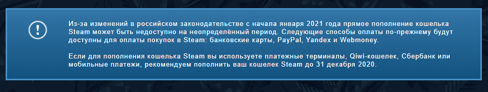 Из-за изменений в российском законодательстве с начала января 2021 года прямое пополнение кошелька Steam может быть недоступно на неопределённый период. Следующие способы оплаты по-прежнему будут доступны для оплаты покупок в Steam: банковские карты, PayPal, Yandex и Webmoney.