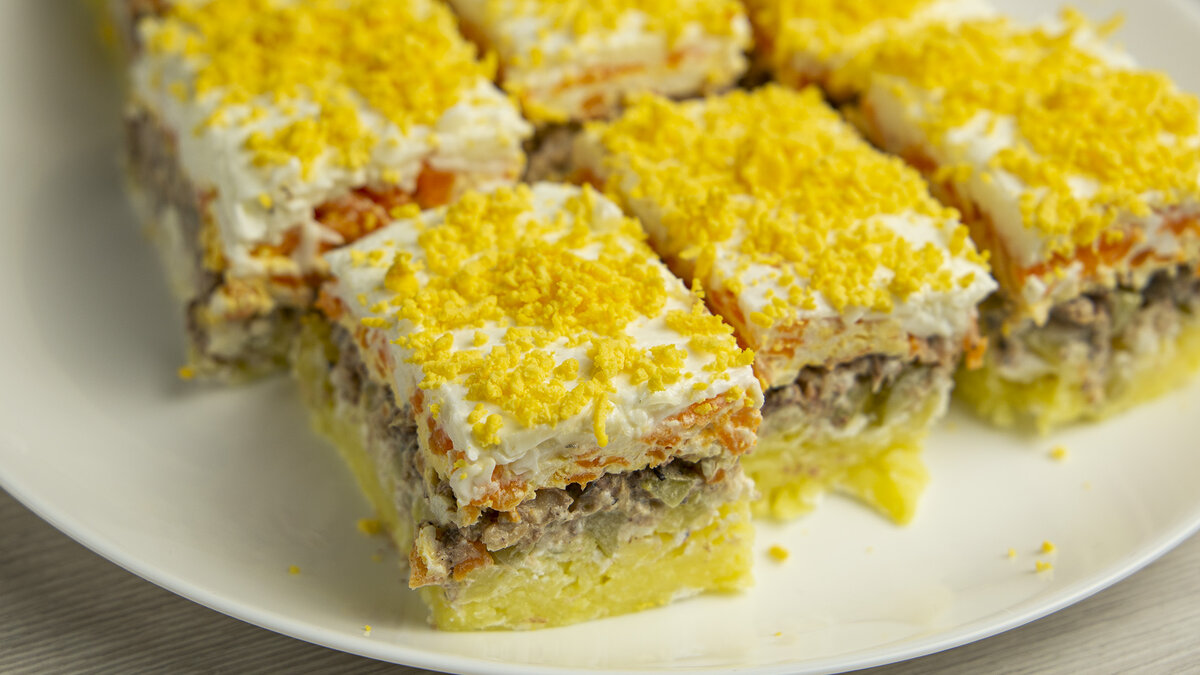 13.С помощью тарелки или разделочной доски переворачиваем салат на другую сторону, снимаем форму, убираем пищевую пленку. Разрезаем салат на порционные кусочки и украшаем салат желтками