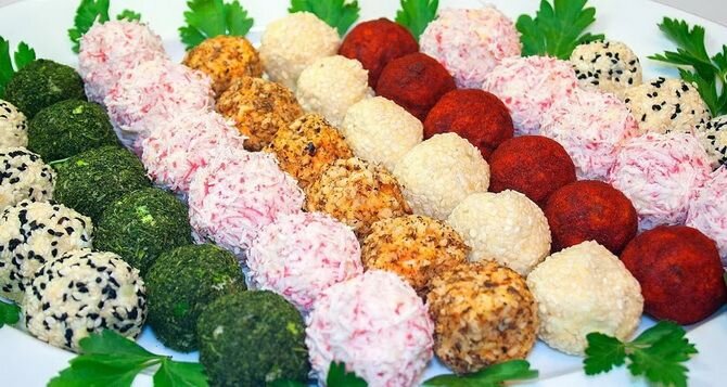 В качестве основы для таких новогодних закусочных шариков можно использовать еврейский или крабовый салат, смесь из слабосоленой семги, картофеля, яйца и майонеза.