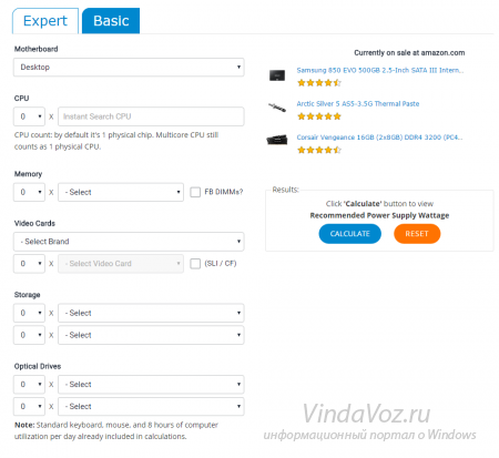 Есть два вида калькулятора - Базовый (Basic) и Экспертный (Expert). Из названия можно догадаться для чего какой нужен. Используя второй можно так же указать сколько часов будет работать блок питания, модели для биткоинов, кулера (вентиляторы), скорость и частоту процессора, клавиатуру/мышь и т.д. В общем учесть всё более детально (для знающих).