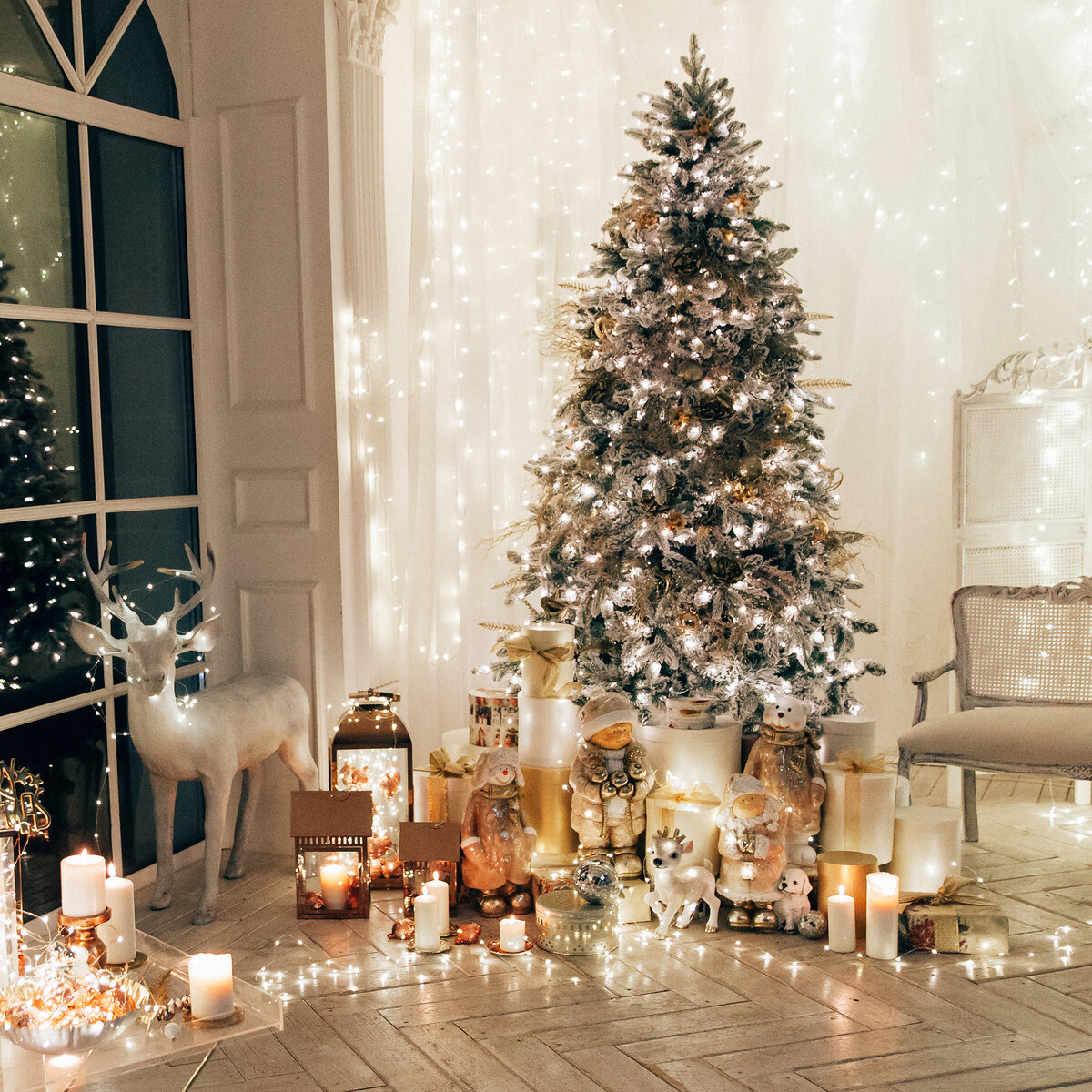Искусственный снег и большие свечи в красивых праздничных подсвечниках идеально дополнят новогодний интерьер.