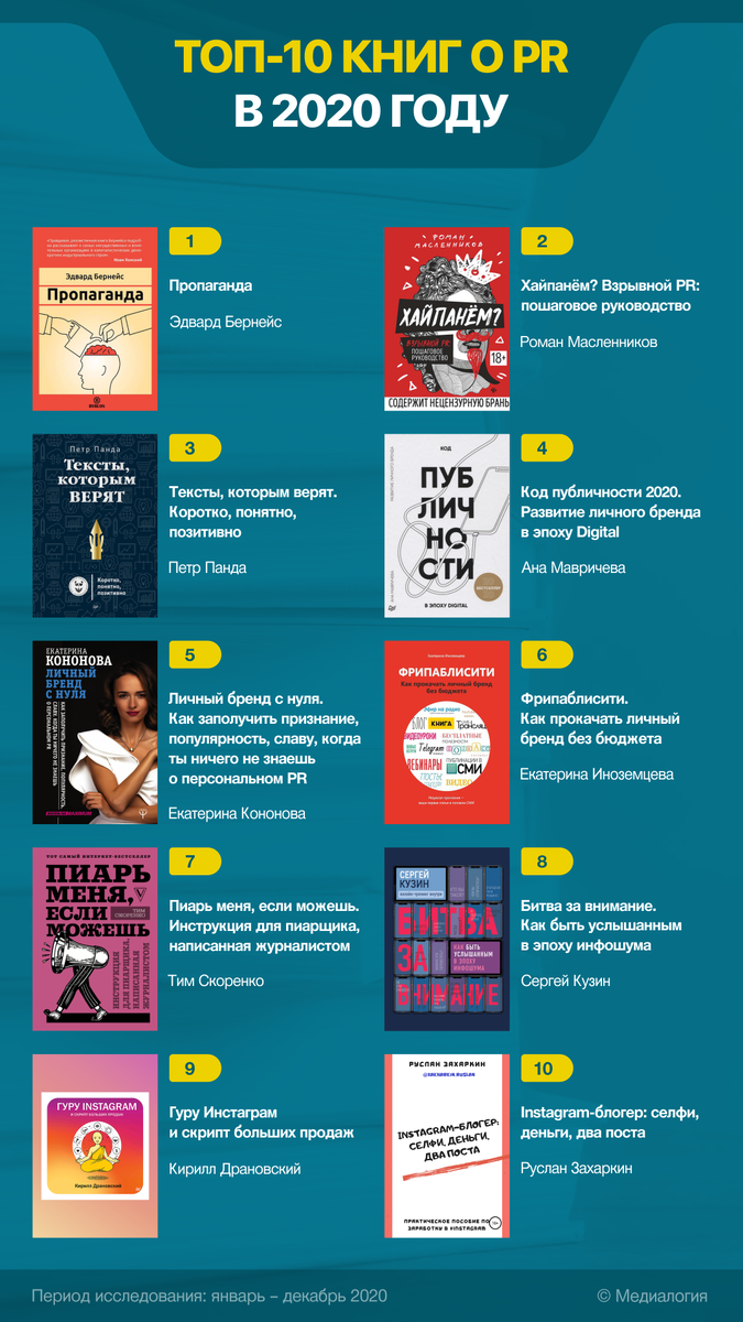 Независимая исследовательская компания «Медиалогия» и ЛитРес, крупнейший книжный сервис в России и странах СНГ, составили рейтинг самых популярных книг о PR за 2020 год. В список вошли самые популярные и упоминаемые произведения по количеству сообщений в соцмедиа. Лидирует в рейтинге книга Эдварда Бернейса «Пропаганда» (1,8 тыс. сообщений), на второй позиции «Хайпанём? Взрывной PR: пошаговое руководство» Романа Масленникова (1,42 тыс. сообщений) и на третьем месте книга Петра Панда «Тексты, которым верят. Коротко, понятно, позитивно».