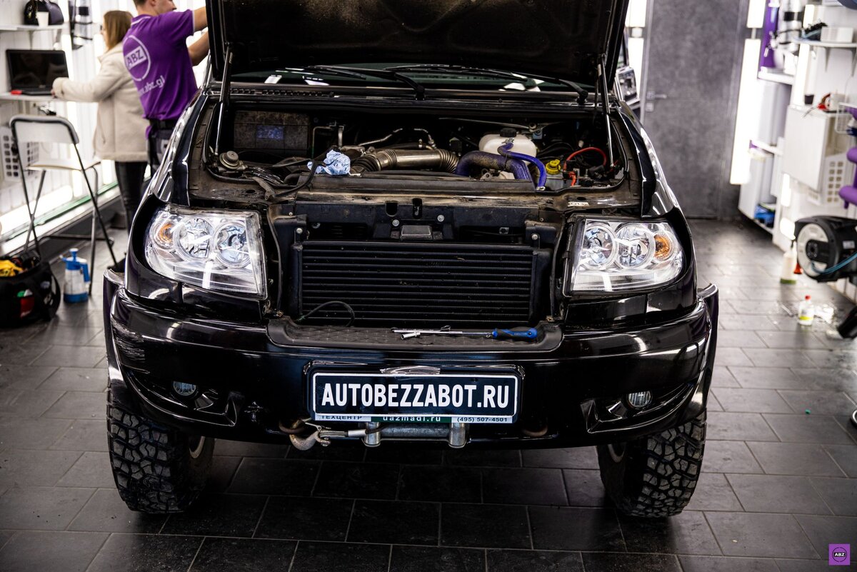 Патриот, который приехал к нам в АвтоБезЗабот, уже имеет солидный пробег и повреждения на лакокрасочном покрытии, поэтому защитить автомобиль полностью сразу не получилось.