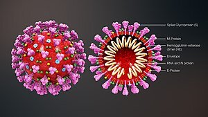 Коронавирусы имеют РНК около 26—30 тысяч пар оснований, это означает, что коронавирусы обладают крупнейшей несегментированной РНК среди всех известных вирусов, то есть являются сложнейшими по структуре среди известных вирусов. Геном вируса состоит из более чем 20 000 нуклеотидов и кодирует два репликативных полипротеина pp1a и pp1ab[13][14], из которых в следующий проход репликации/трансляции формируется копия РНК вируса, а также 8 отдельных мРНК-шаблонов для белков вирусов, которые бесконечно их генерируют. Генерация белков M, S, HE и E, попадающих в мембранную липидную оболочку вируса, происходит на соответствующих мРНК в эндоплазматическом ретикулуме клетки; белок же N, который будет окружать геномную РНК вируса, синтезируется на мРНК, плавающих в цитоплазме клетки[12].