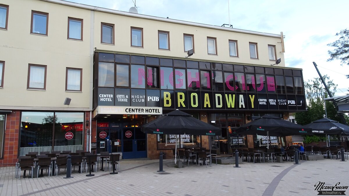 Вот, например, здание гостиницы совмещённой с клубом и магазином в Иматре. С этой стороны и не скажешь, что на крыше, на уровне второго этажа, стоят автомобили.
