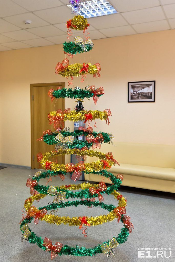 А можно и не закреплять на потолке дерево, а просто подвесить гирлянду крупных шаров (однотонных или цветных) в форме пирамидки, напоминающей елку.