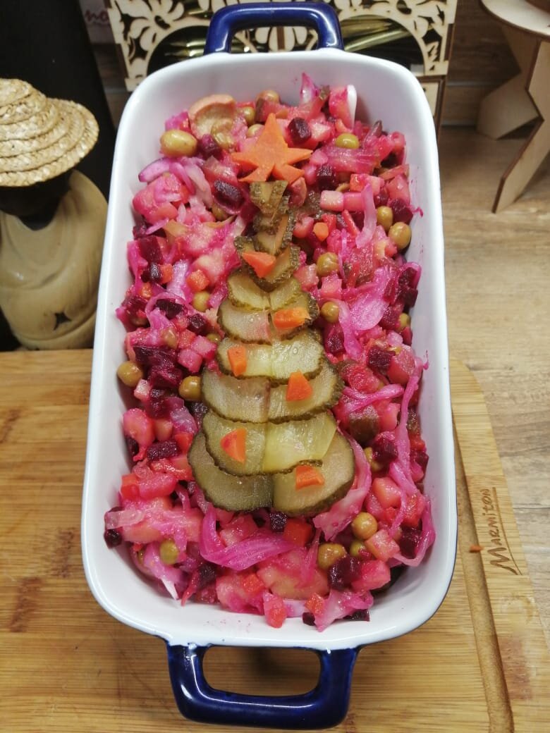 Готовый винегрет выкладываем в красивое блюдо и украшаем ёлочкой из солёного огурца.