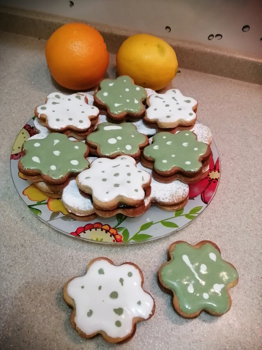 Готовое печенье остужаем, склеиваем попарно джемом, и посыпаем сахарной пудрой или покрываем глазурью, как это сделали мы.
