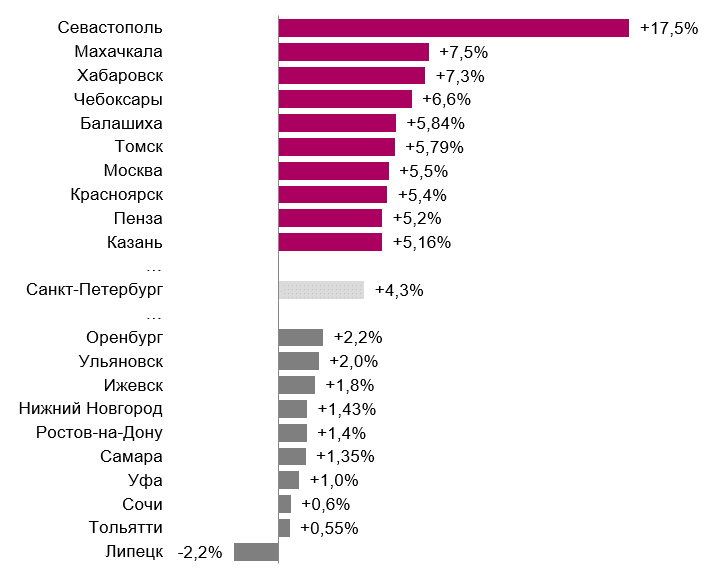 Минимальный рост зарплат отмечался в Липецке (+630 руб., до 37,9 тыс. руб.), Сочи (+1,56 тыс. руб., до 39,9 тыс. руб.), Тольятти (+1,66 тыс. руб., до 36,8 тыс. руб.), Ижевске (+1,87 тыс. руб., или до 36,8 тыс. руб.), Ульяновске (+1,88 тыс. руб., до 32,7 тыс. руб.), Оренбурге (+1,9 тыс. руб., до 38,6 тыс. руб.), Ростове-на-Дону (+2,02 тыс. руб., до 42,2 тыс. руб.), Уфе (+2,06 тыс. руб., до 45,3 тыс. руб.), Самаре (+2,15 тыс. руб. до 40,8 тыс. руб.) и Перми (+2,21 тыс. руб. до 42,4 тыс. руб.)