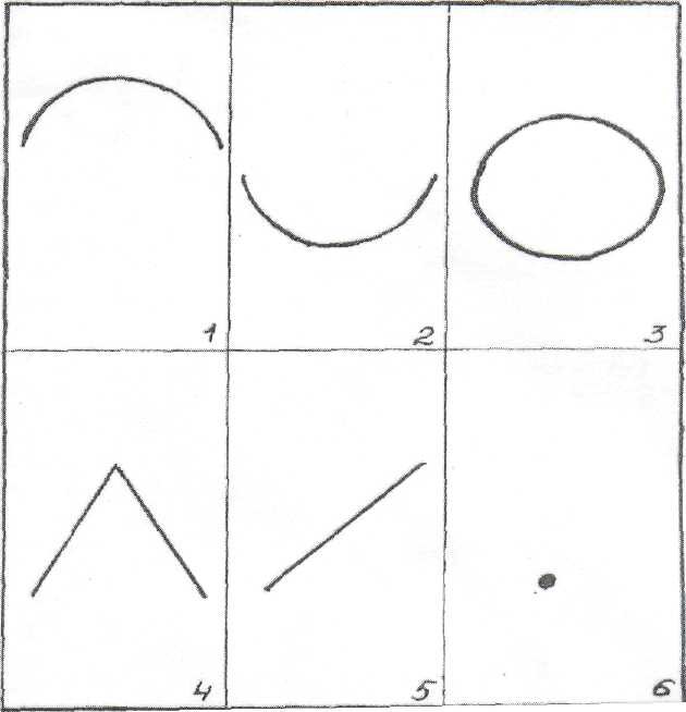 - Изображение 5 (косая линия): "Ваше представление о Карьере". «Восходящий» характер самой обычно провоцирует содержания «подъема», «восхождения», движения вверх или вниз. Интерпретация здесь такова: «С какими символами, качествами, образами и т.п. пациент связывает свое представление о карьере, жизненной перспективе и т.д.