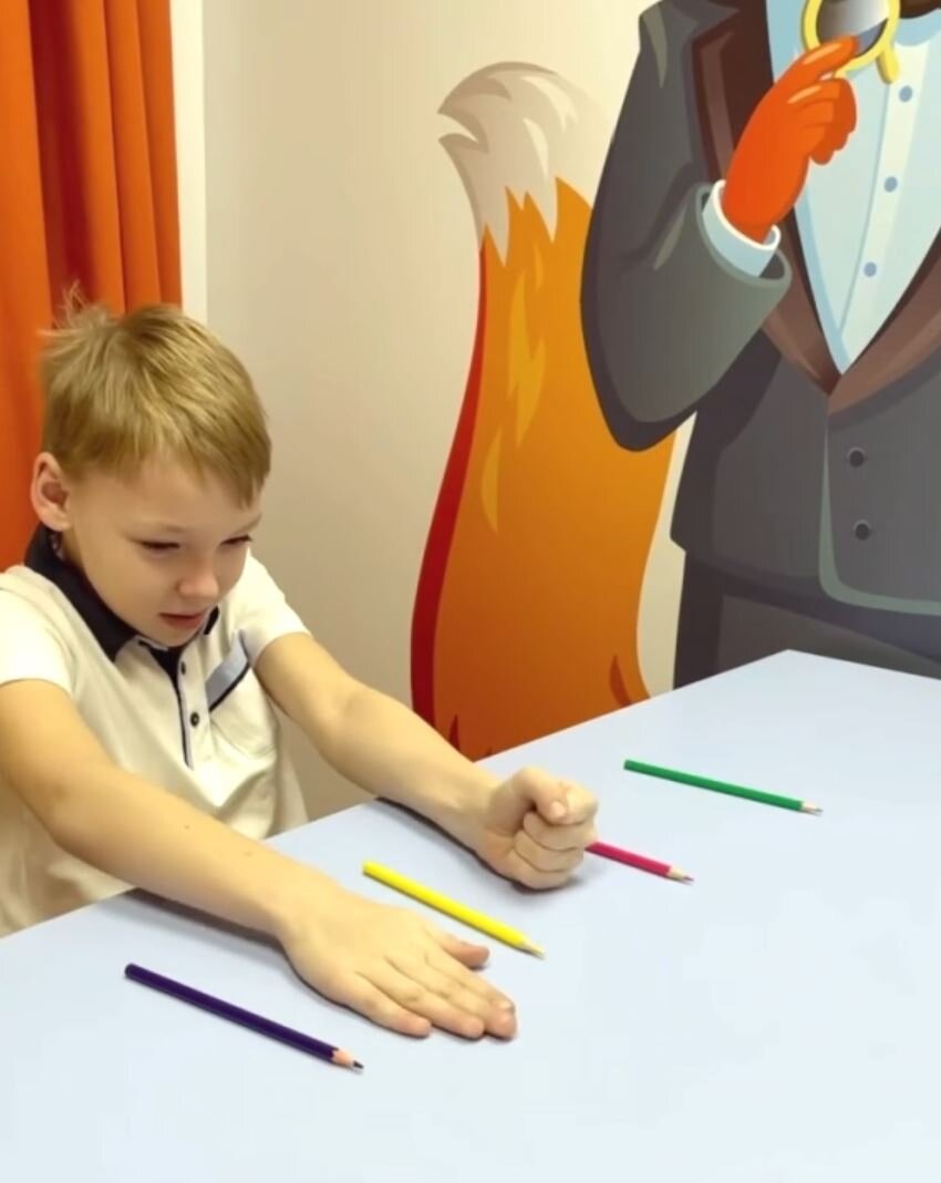 — Это упражнение похоже на предыдущее, но потруднее. Положите на стол 4 или 5 карандашей, а руки — по обе стороны от крайнего карандаша. Причем одна рука должна быть сжата в кулак, а вторая — с открытой ладонью. Хлопните в ладоши и переместите руки к следующему карандашу, только теперь кулак должен быть сжат уже на другой руке. Посмотрите, как ловко справляется наш ученик Кирилл! Чтобы усложнить упражнение, возьмите больше карандашей и ускоряйте темп.