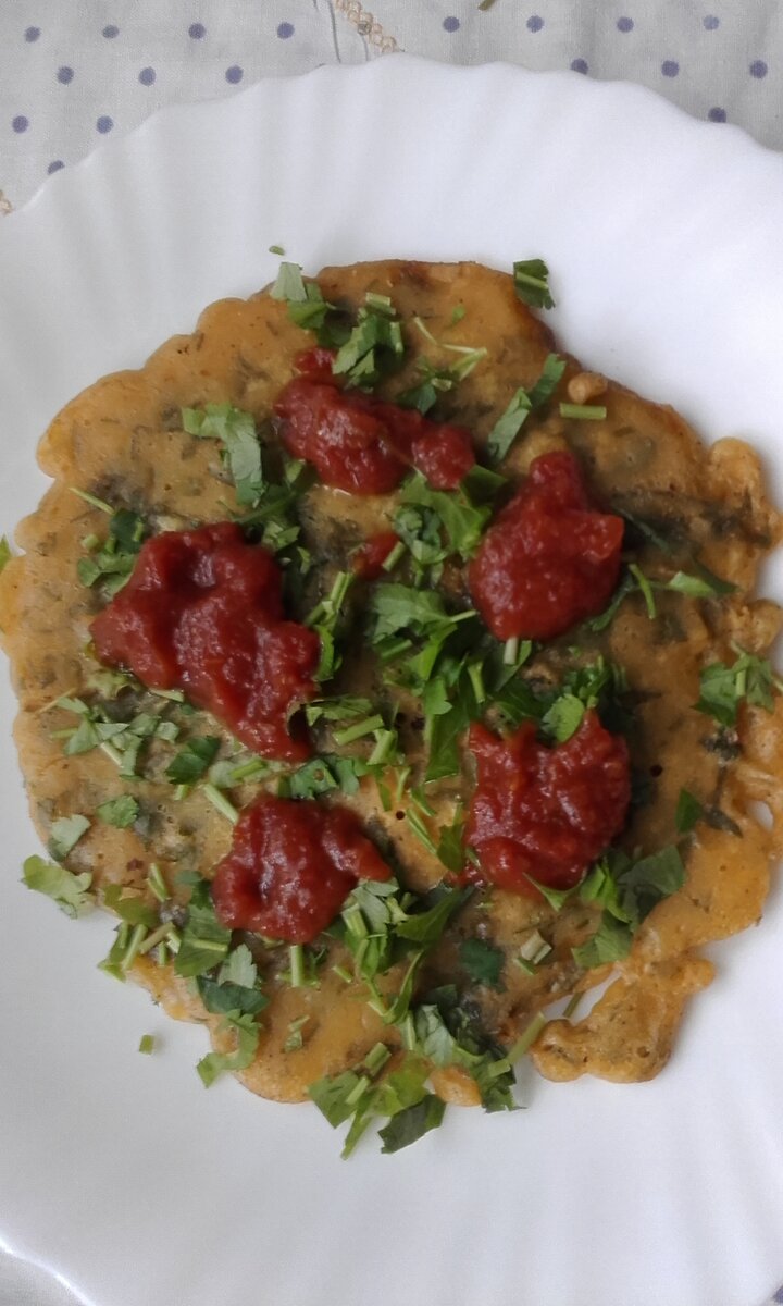 Теперь, в общем, как и с настоящим омлетом - на разогретую с маслом сковороду выкладываем/выливаем эту смесь. Предварительно на сковороде можно обжарить какие-то добавки – зелень, овощи – и уже их залить нутовой смесью. Жарим на небольшом огне.