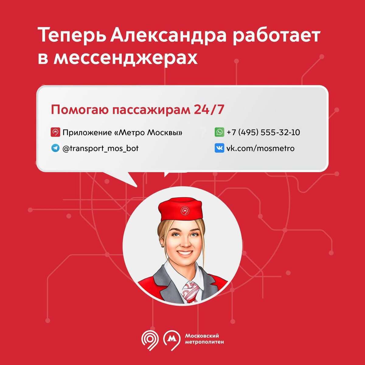 Александра выходит в мессенджеры. С сегодняшнего дня наш метробот можно найти не только в приложении «Метро Москвы» (Google Play, App Store и AppGallery), а ещё в WhatsApp, Telegram, а также в аккаунте мосметро ВКонтакте.