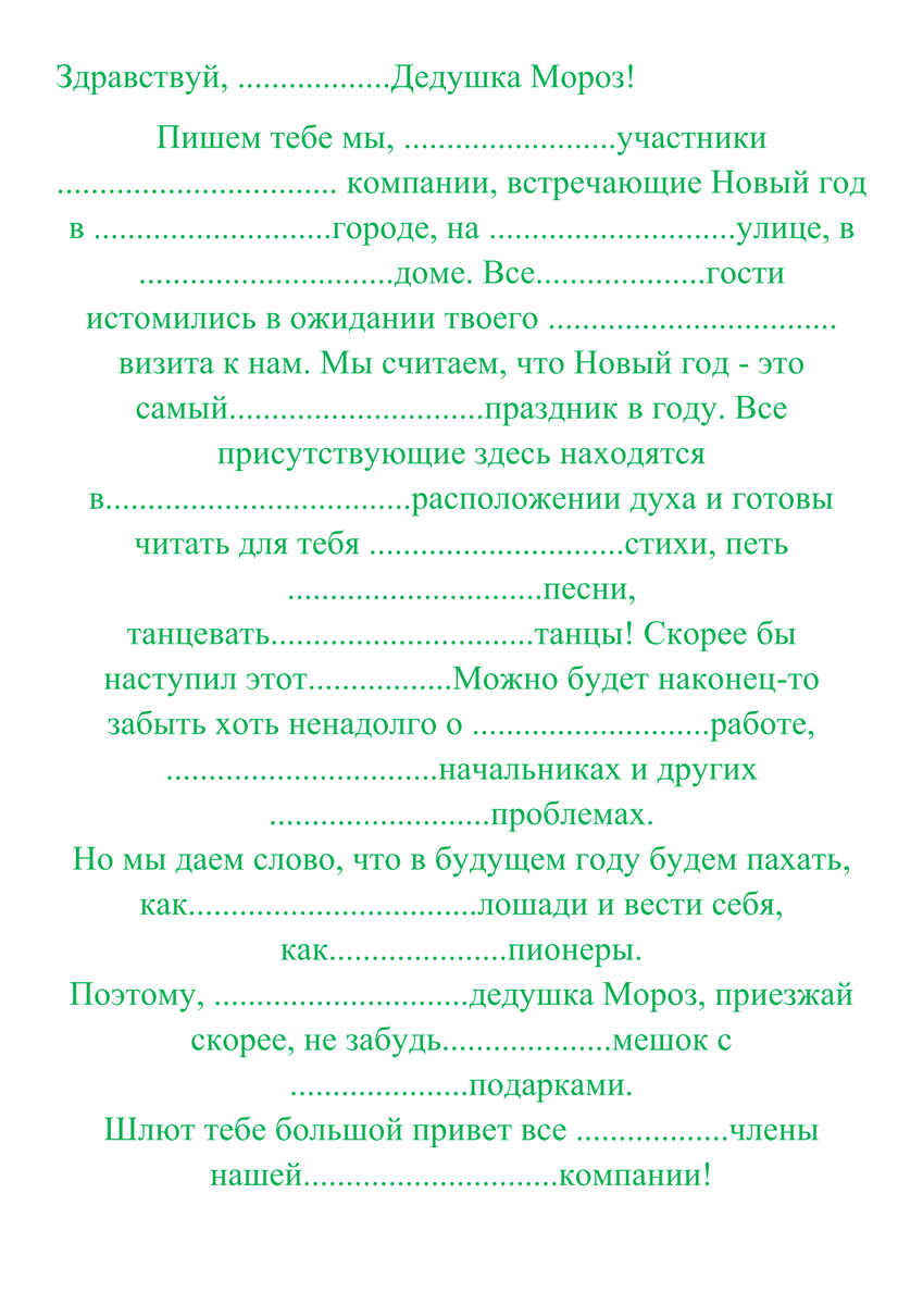 Пишем письмо Деду Морозу. Берем готовый шаблон, куда следует вставить смешные прилагательные. Все гости вовлечены в процесс. Потом зачитываем, что у нас получилось. Если письмо писали в прошлом году, можно "получить" ответ от Деда Мороза, также вставив забавные прилагательные.