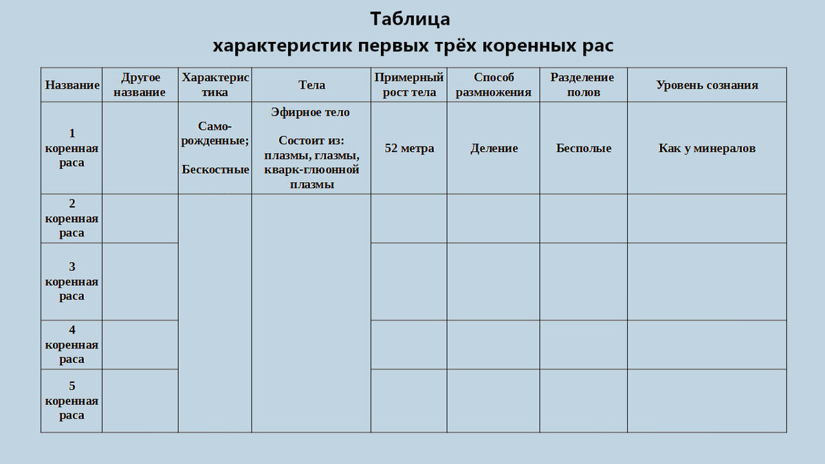 Прошлая статья была посвящена общим характеристикам всех семи коренных рас. Сегодня мы коротко рассмотрим первые три коренные расы, а появление четвёртой и пятой коренных рас, мы рассмотрим в будущем. Заранее предупреждаю читателей о том, что информация посвященная первым трём коренным расам, является одной из самых сложных, а возможно самой сложной и запутанной информацией во всей Теософии. Многие вопросы связанные с происхождением галактик, звездных систем и планет, являются сегодня неплохо изученными в науке, поэтому древние постулаты Теософии стали легко понимаемыми. Это же касается многих постулатов Теософии в области элементарных частиц (материи), так как современные достижения физики очень сильно облегчили процесс понимания исследователям Теософии. Но сегодня мы будем рассматривать то, что официальной науке вообще неизвестно, а именно первые коренные расы человечества, которые и на человечество, в привычном нам понимании, долгое время вообще не были похожи. Во вторых, изучение предмета очень сильно усложняется большим количеством нюансов, которые начиная с четвёртой коренной расы почти полностью исчезают. Все самое сложное в появлении человечества, содержится в первых трёх коренных расах, четвёртого круга эволюции, на четвёртой планете в любой планетной цепи. Так как тема очень огромная и не особо сильно интересует среднестатистического человека, то многое мы сократим, оставив только важные элементы.