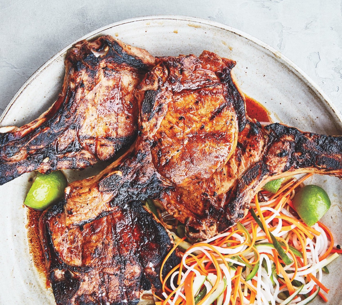Рецепт здесь требует тонко нарезанных свиных отбивных с костями (в идеале толщиной менее дюйма). Если вы не можете купить их уже тонко нарезанными, просто положите все свиные отбивные, которые у вас есть, между листами полиэтиленовой пленки и немного отбейте их мясным молотком или дном тяжелой сковороды (осторожно с костью). Вы также можете заменить стейк из свиной вырезки или даже тонко нарезанную бескостную свиную лопатку (текстура лопатки будет немного жестче, но жир и вкус великолепны).