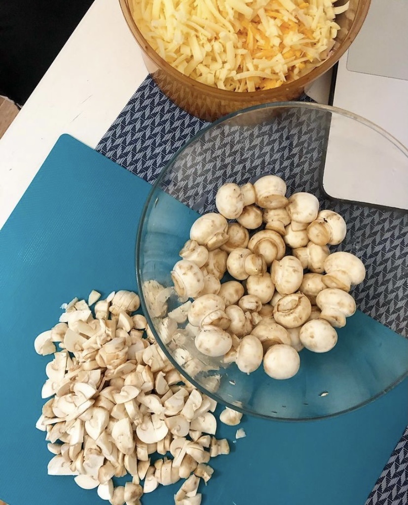 Далее мелко нарезаем шампиньоны и ветчину, натираем сыр, обжариваем все на воде. Смешиваем все со сметаной и добавляем специи.
