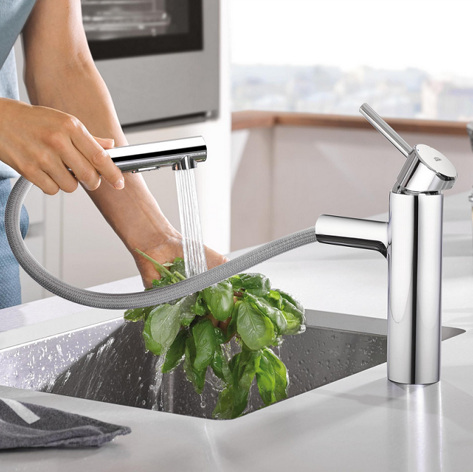 На кухне гибкий смеситель будет в разы удобнее обычного крана — и чтобы помыть продукты и посуду, и чтобы ополоснуть раковину: вы сами будете направлять струю воды в нужное место.