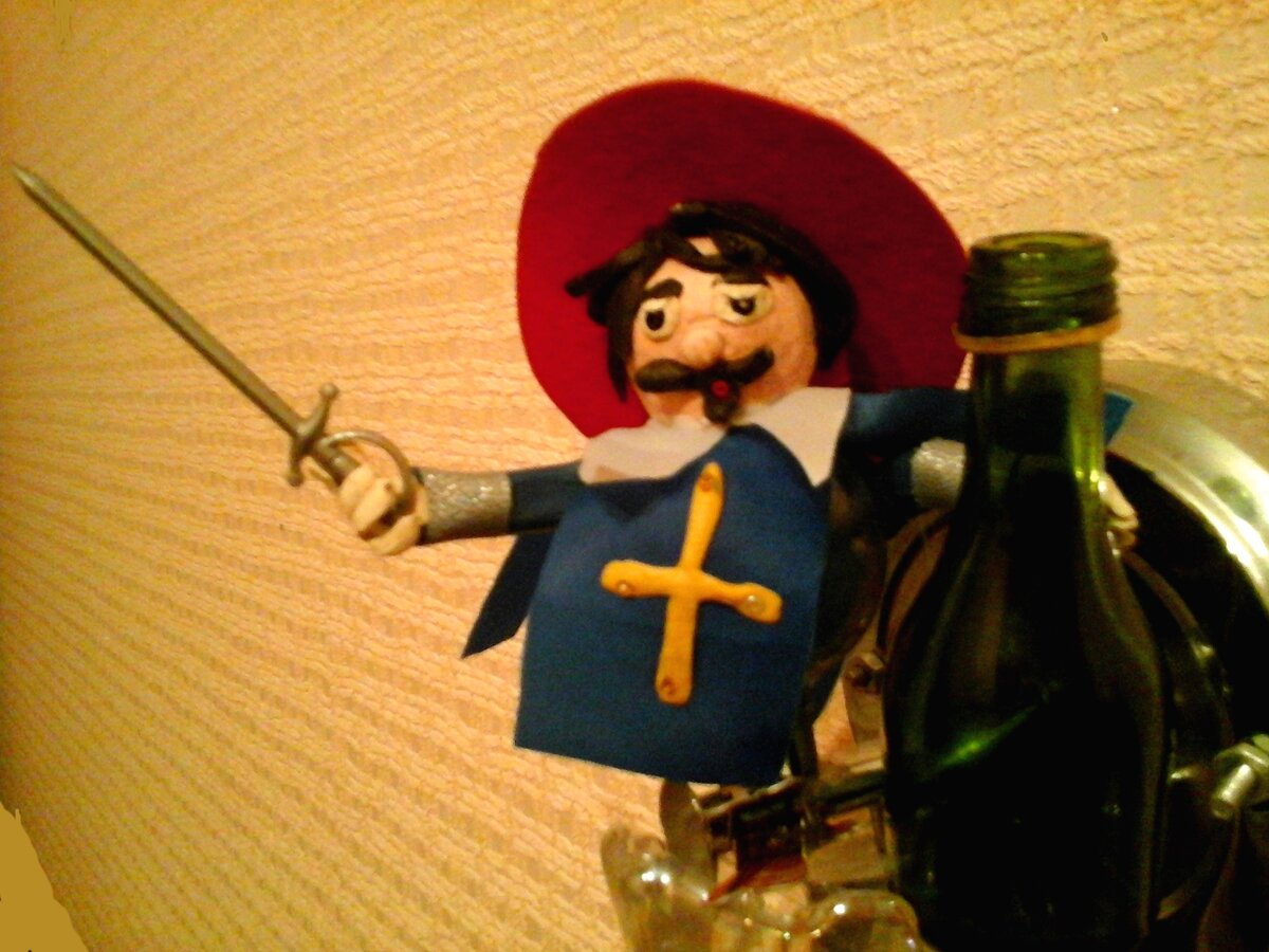 Конечно же, мушкетёры. А кто есть кто - подскажут их атрибуты: бутылка, конфета, книжка и конь тигриной масти.