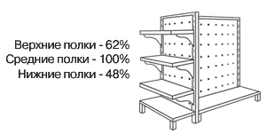 Если говорить более простым языком, то при определении «Золотой полки» следует прежде всего учитывать средний рост целевой аудитории. Так, в магазинах с детскими товарами «Золотыми полками» будут считаться полки, находящиеся на уровне 30-100 см, в магазинах, к целевой аудитории которых относятся взрослые люди, «Золотыми полками» являются полки 120-170 см от уровня пола.