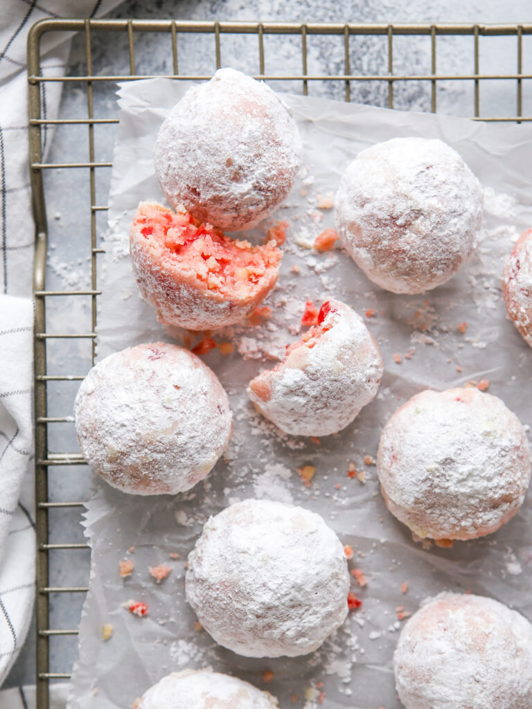- Дайте остыть около 5 минут, затем обваляйте в сахарной пудре. Верните покрытое печенье на противень и дайте ему полностью остыть. Как только остынет, снова обвалять в сахарной пудре.