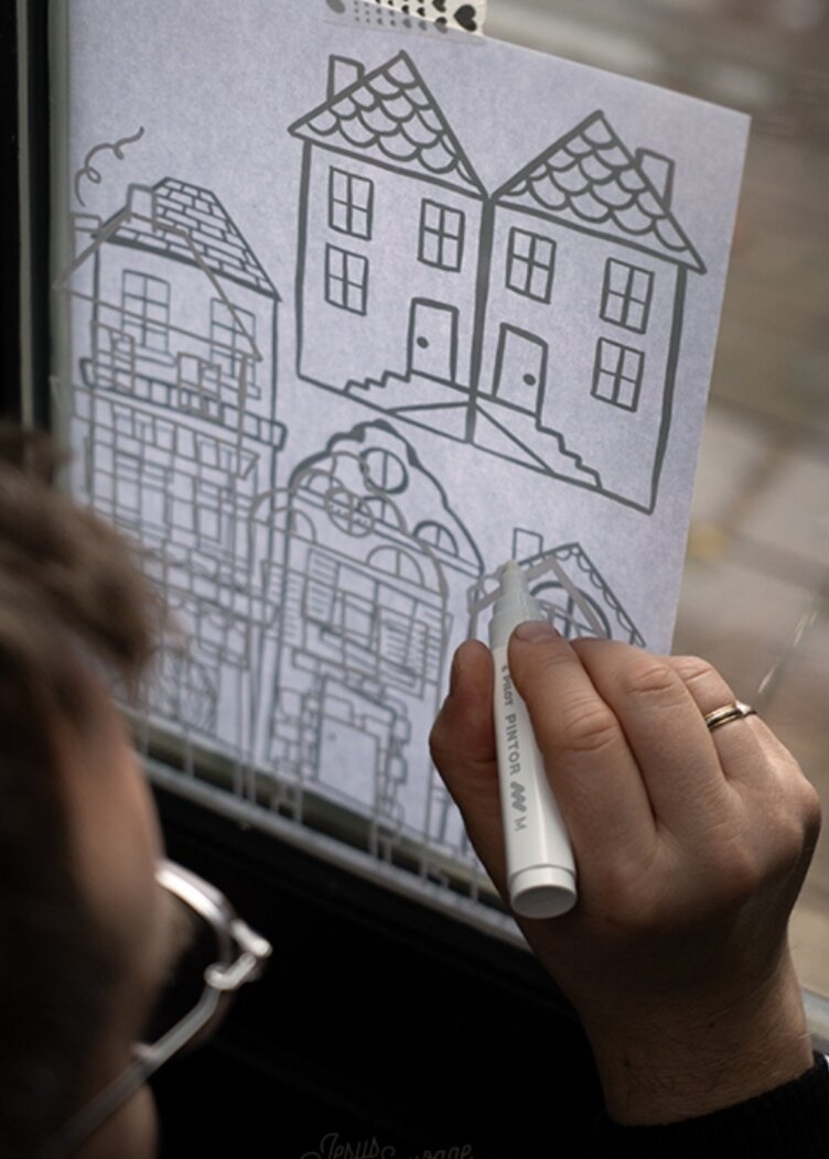 Это может быть рисунок меловыми маркерами, рисунок может быть нанесён гуашью, так же вы можете использовать для нанесения рисунка карандаш корректор концелярский.