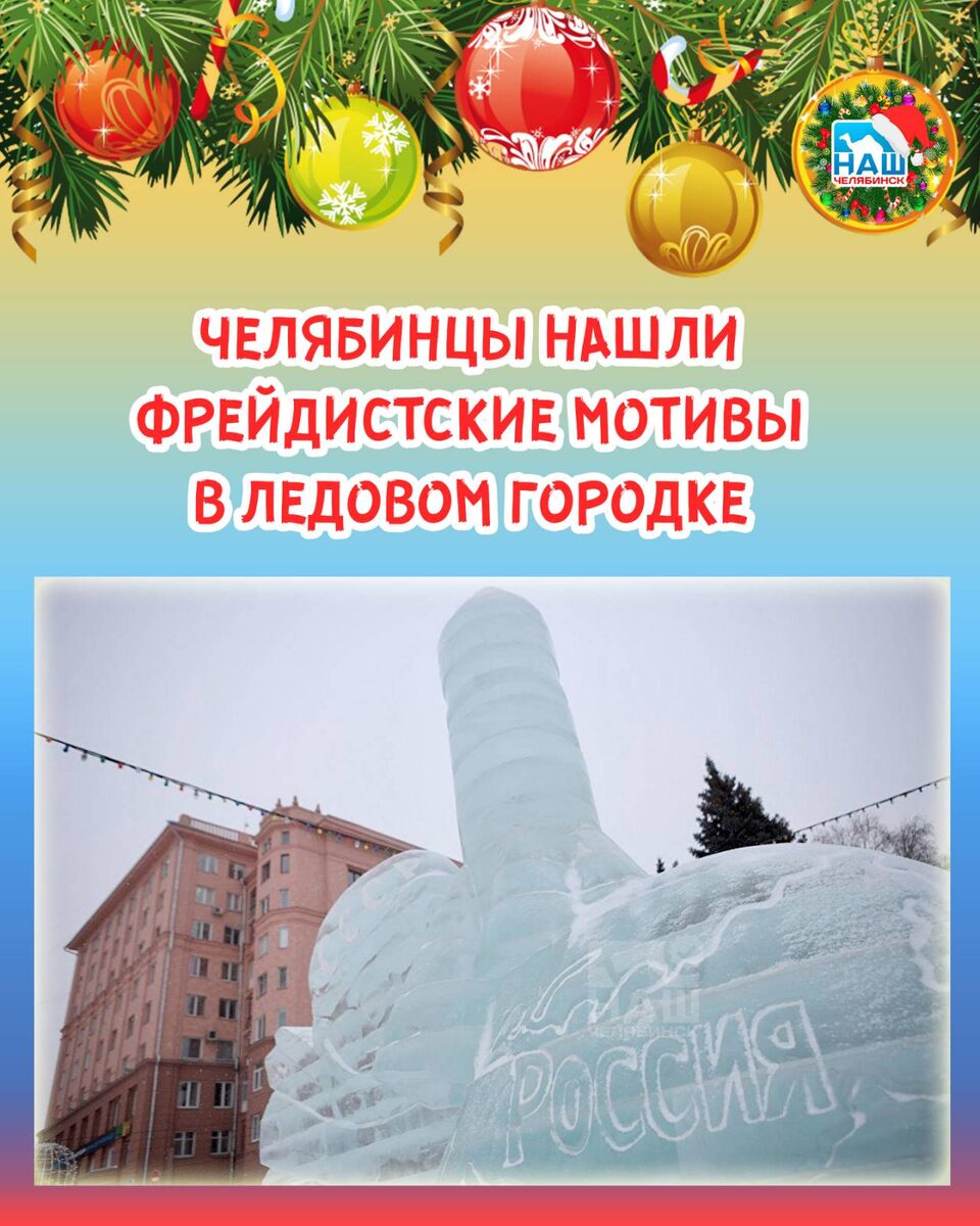 В этом году главную новогоднюю площадку столицы Южного Урала сделали в комической тематике: построили скульптуры инопланетян, космонавтов и ракет. С последними вышла небольшая промашка. Горожане, обсуждая фотографии ледяных изваяний, отмечают двусмысленную форму ракет и намекают на фрейдистские мотивы у авторов скульптур . Как-то не очень на ракету скульптура похожа