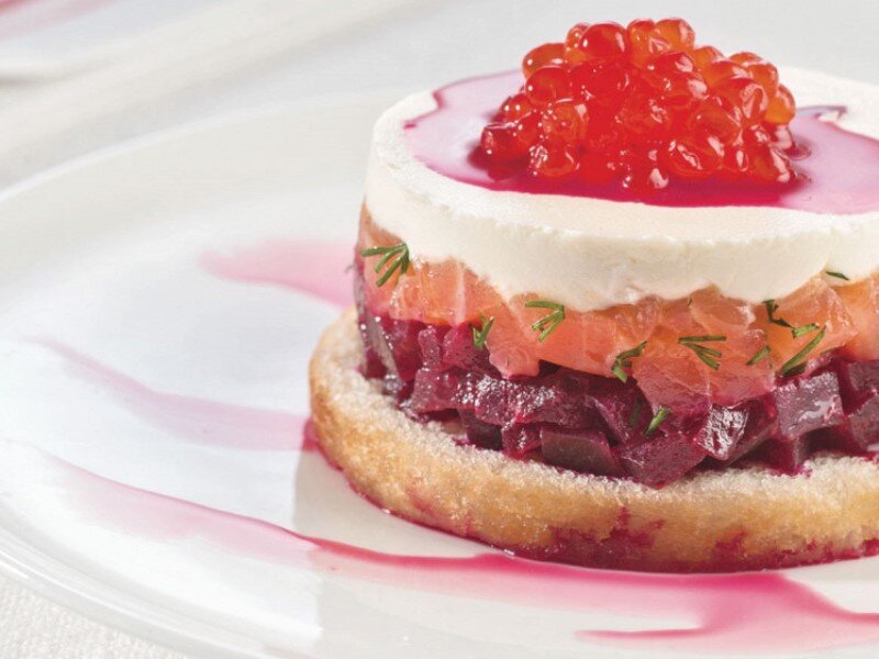 Сверху аккуратно украшаем красной икрой и снимаем формочку.