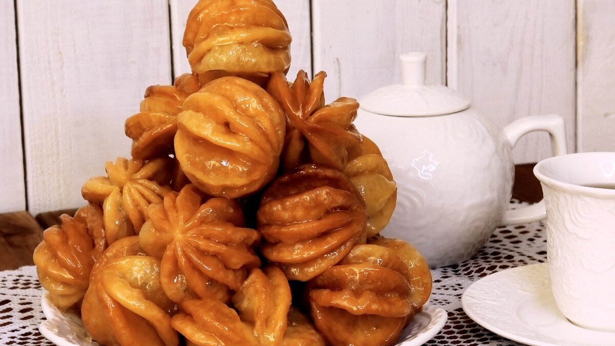 Всем привет! Сегодня от души хочу порекомендовать вот такой интересный рецепт чак- чака! Сладкий, медовый, воздушный, хрустящий и в тоже время нежный именно такой он по вкусу. Этот необычный десерт обязательно привлечет к себе внимание всех ваших гостей и они будут удивляться и хвалить хозяюшку за её золотые руки и умения. Такой чак- чак можно приготовить на юбилей, свадьбу или никах и он только украсит ваш праздничный стол своей красотой! А готовится сладость проще простого и не отнимет много времени, тесто легкое и приятное в работе, хорошо раскатывается и послушное. Обязательно приготовьте такой чак- чак к семейному чаепитию и порадуйте себя и своих гостей! *Тесто* -2 желтка -300 гр муки в/с -2 стол.л сметаны -100 мл воды -50 гр мягкого сливочного масла -1/2 ч.л соли -1/2 ч.л разрыхлителя *Сироп* -150 гр мёда -300 гр сахара -120 мл воды -щепотка лимонной кислоты - 0.8 л растительное масло для жарки 1.Для теста соединить желтки, сливочное масло и соль, перемешать лопаткой. 2.Влить