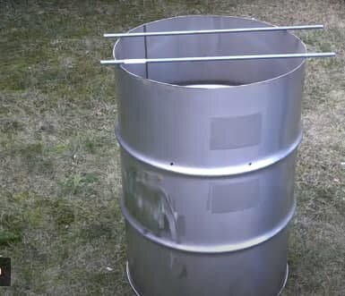 После этого переходим к созданию дымохода. Для этого понадобится кусок стальной трубы. Материал должен подходить для крепления болтами, так как мы делаем без применения сварки. Для гриля понадобится решетка. Ее можно сделать из тонких железных прутьев, а можно купить готовую в магазине.