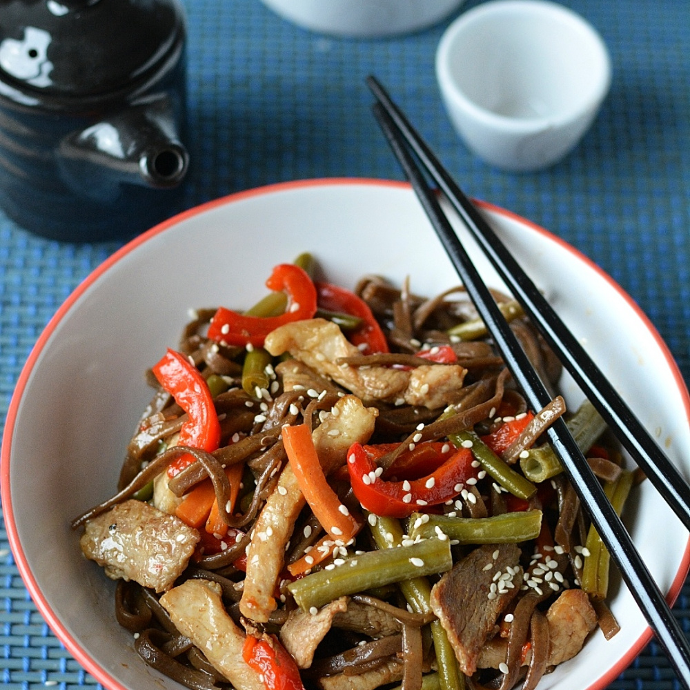 Соба - это японская лапша, приготовленная из гречневой муки, поэтому ее еще называют гречневой лапшой. Рецепты с гречневой лапшой всегда очень простые и сытные, их приготовление не занимает больше 15-20 минут, особенно если готовить в традиционном воке. Соба со свининой и овощами - частый гость на нашем столе. Это просто и очень вкусно! Здесь можно взять и другое мясо, например курицу! Она