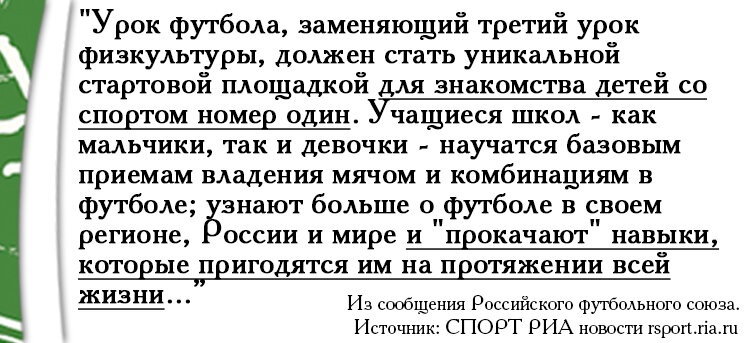 Вот и у меня возникает вопрос: "Для чего?" этот обязательный футбольный курс в школах? Чтоб стало радостнее всем? Почему футбол? Почему не хоккей, самбо, плавание??? Посмотрите, как на этот вопрос отвечают причастные к этой инициативе товарищи: