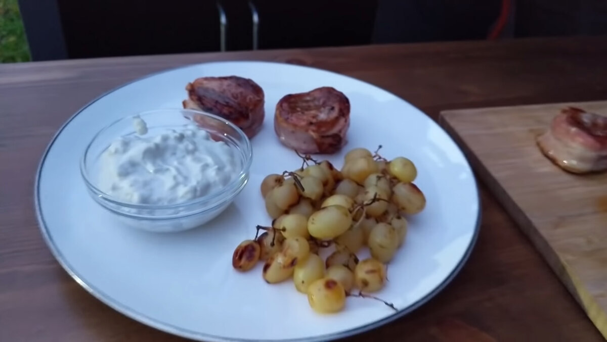 Снимите сначала виноград, затем по готовности – медальоны. Вытащите из мяса зубочистки и подавайте блюдо к столу вместе с соусом.