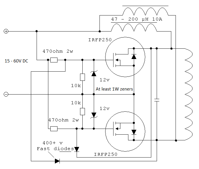 На схеме показан простой металлический нагреватель мощностью около 500-700 Вт, в зависимости от напряжения питания. Схема основана на генераторе Ройера.