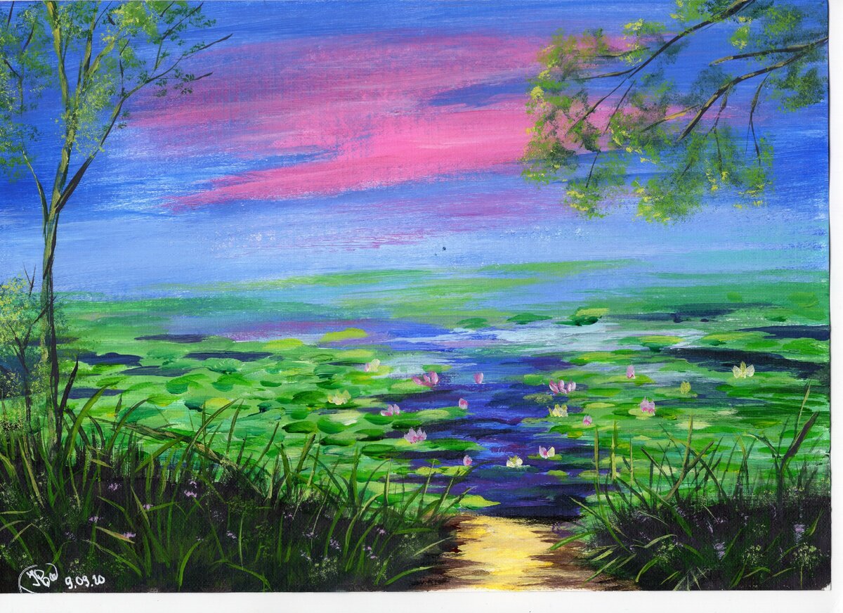 Озеро с лилиями в утренней полудымке. В оригинале этот МК выполняется гуашью, но мне очень хотелось сделать его акрилом. Вот что получилось.