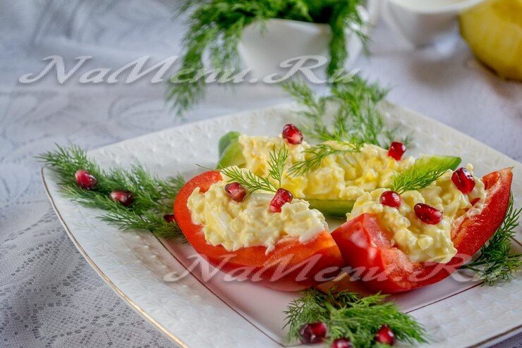 🥄Наполните лодочки из болгарского перца сырно-яичной начинкой и выложите на блюдо. Украсьте их веточками укропа и зернами граната