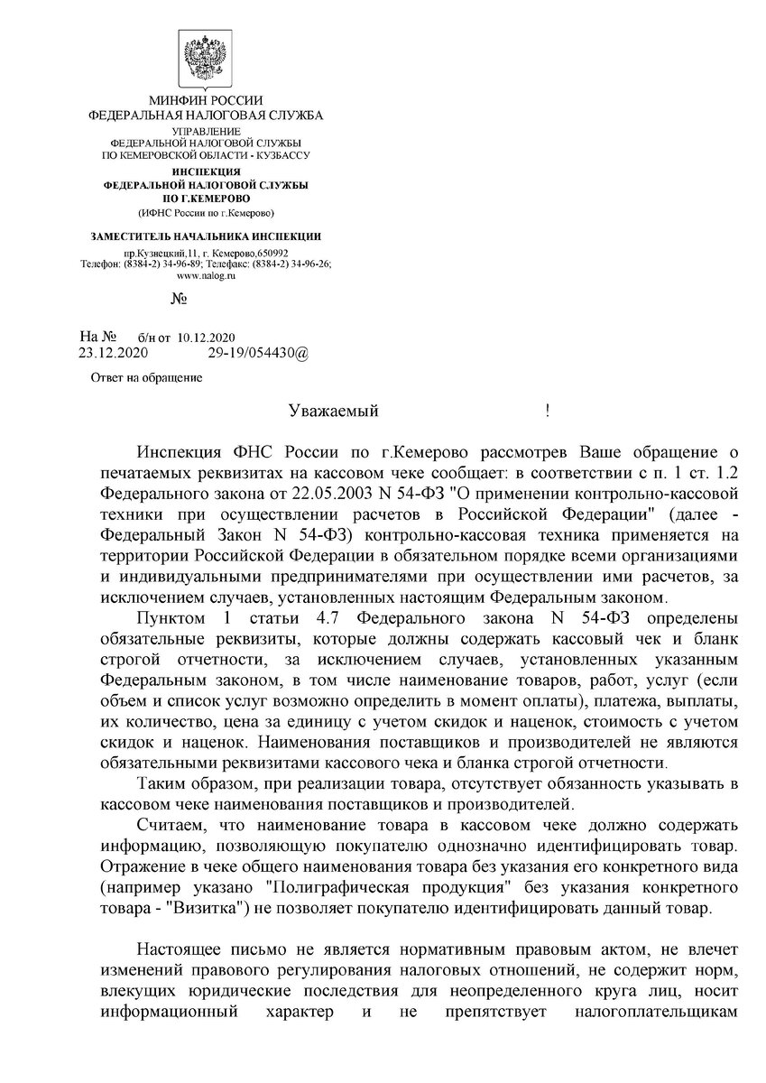 Всем здравствуйте!!! Сегодня хочу опубликовать официальный ответ налоговой службы. Тем кто не читал ранее, напомню, что с 1го февраля 2021 года обязательным реквизитом будет являться наименование позиций в чеке.
